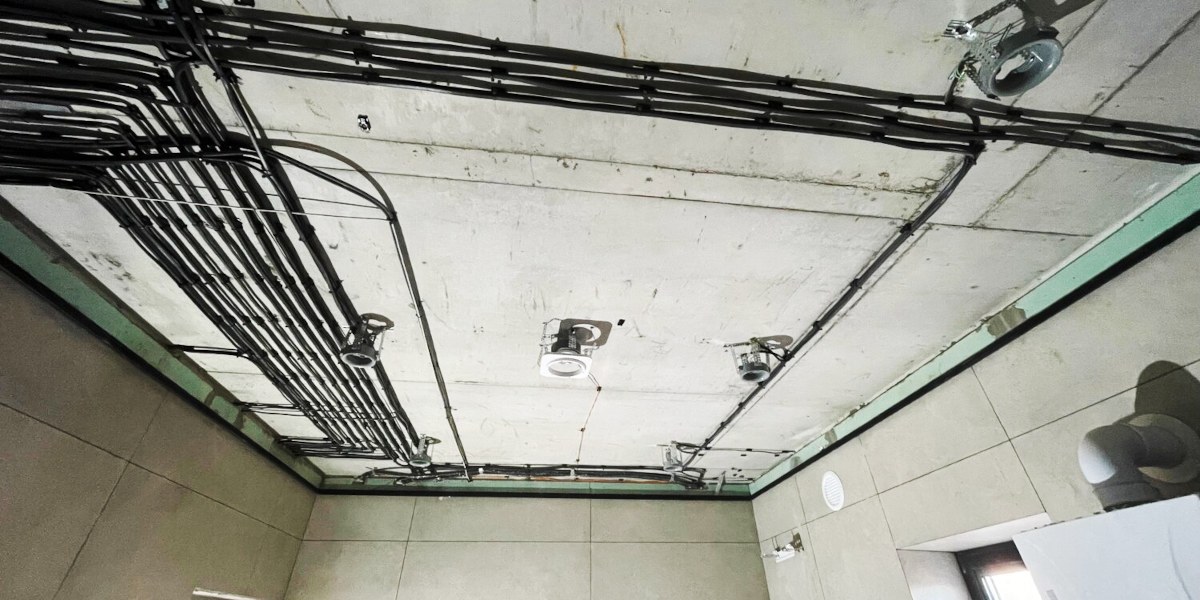 С штукатурным потолком для скрытой проводки придётся штробить плиту перекрытия, а это запрещено строительными нормами. Или прокладывать кабель в накладных каналах, которые портят внешний вид.
