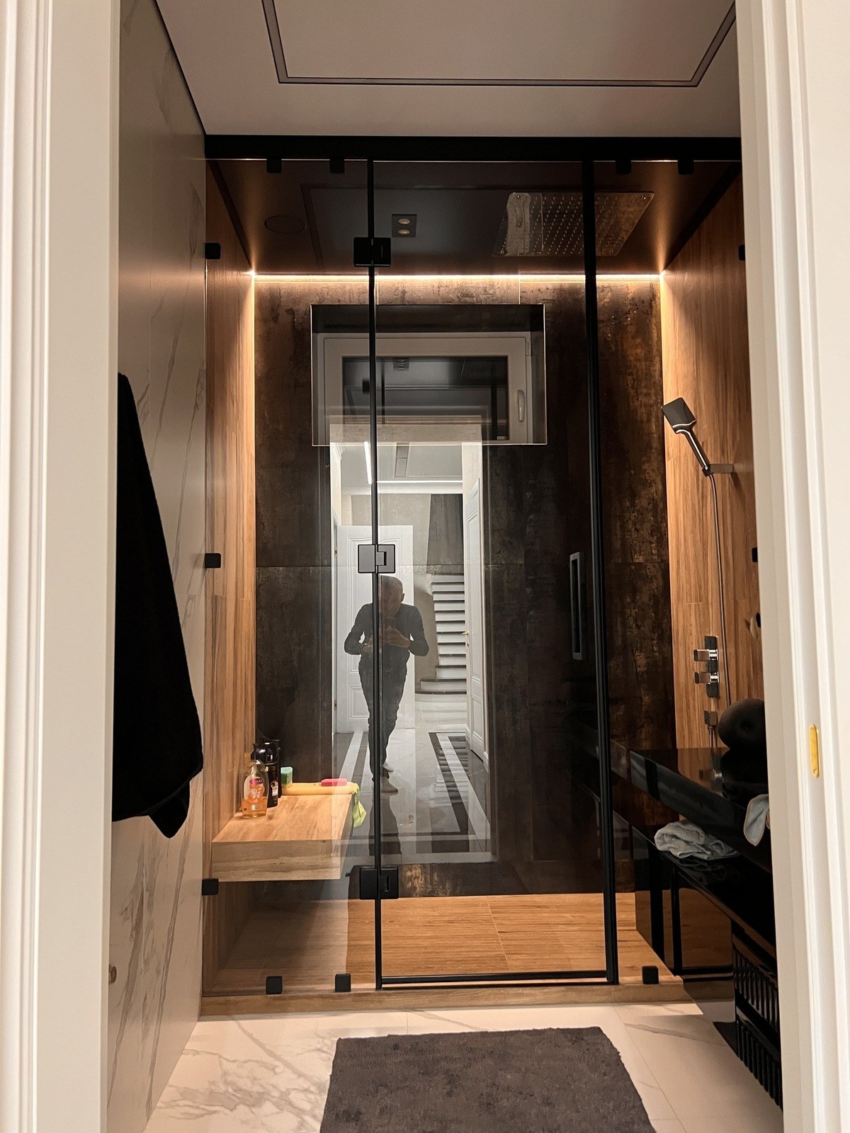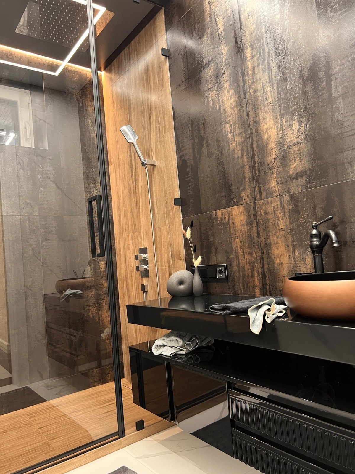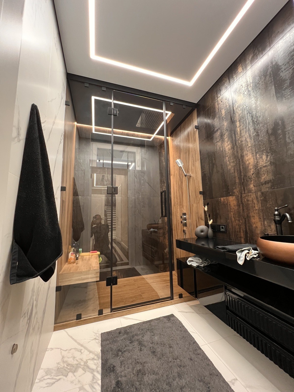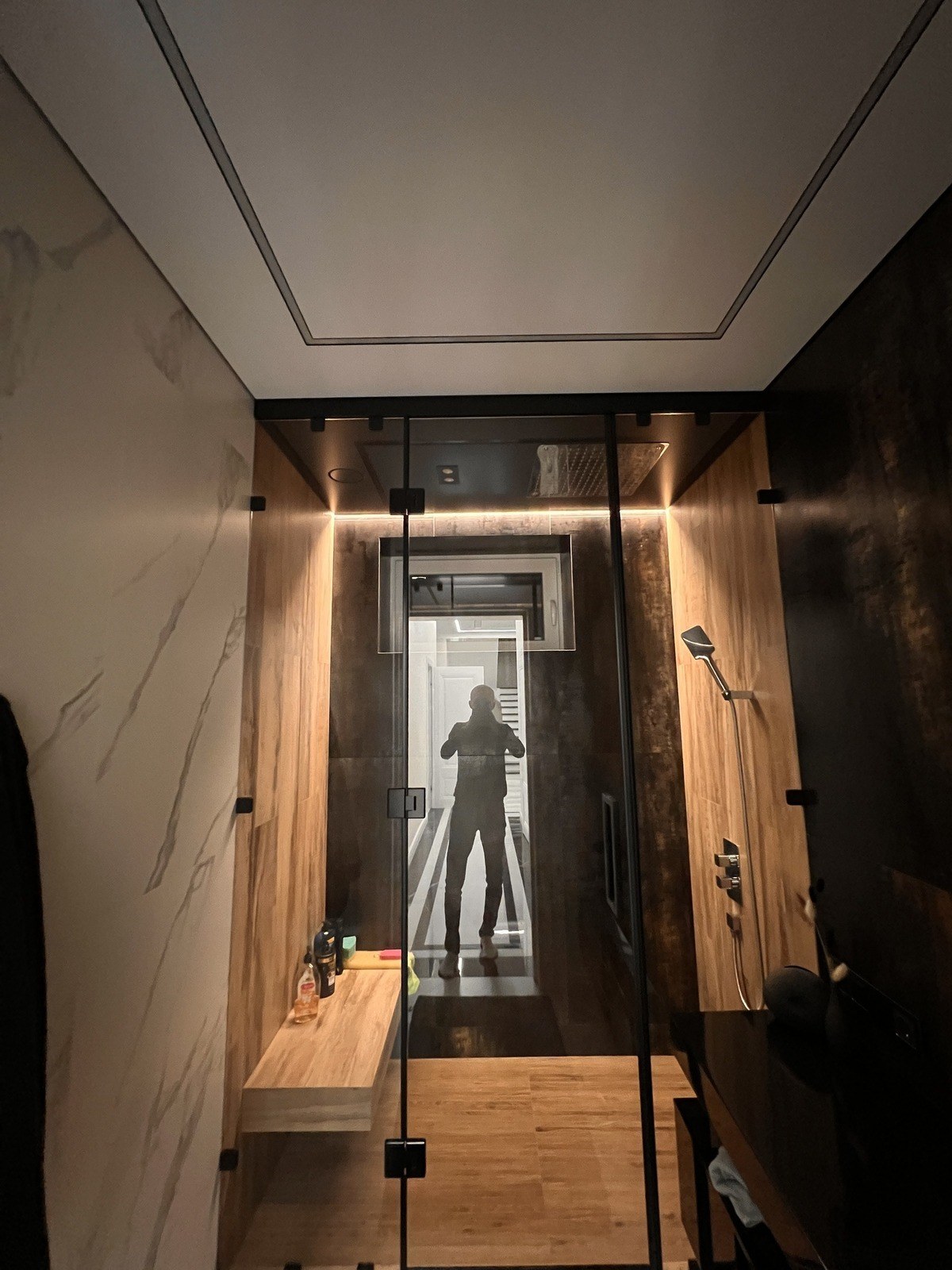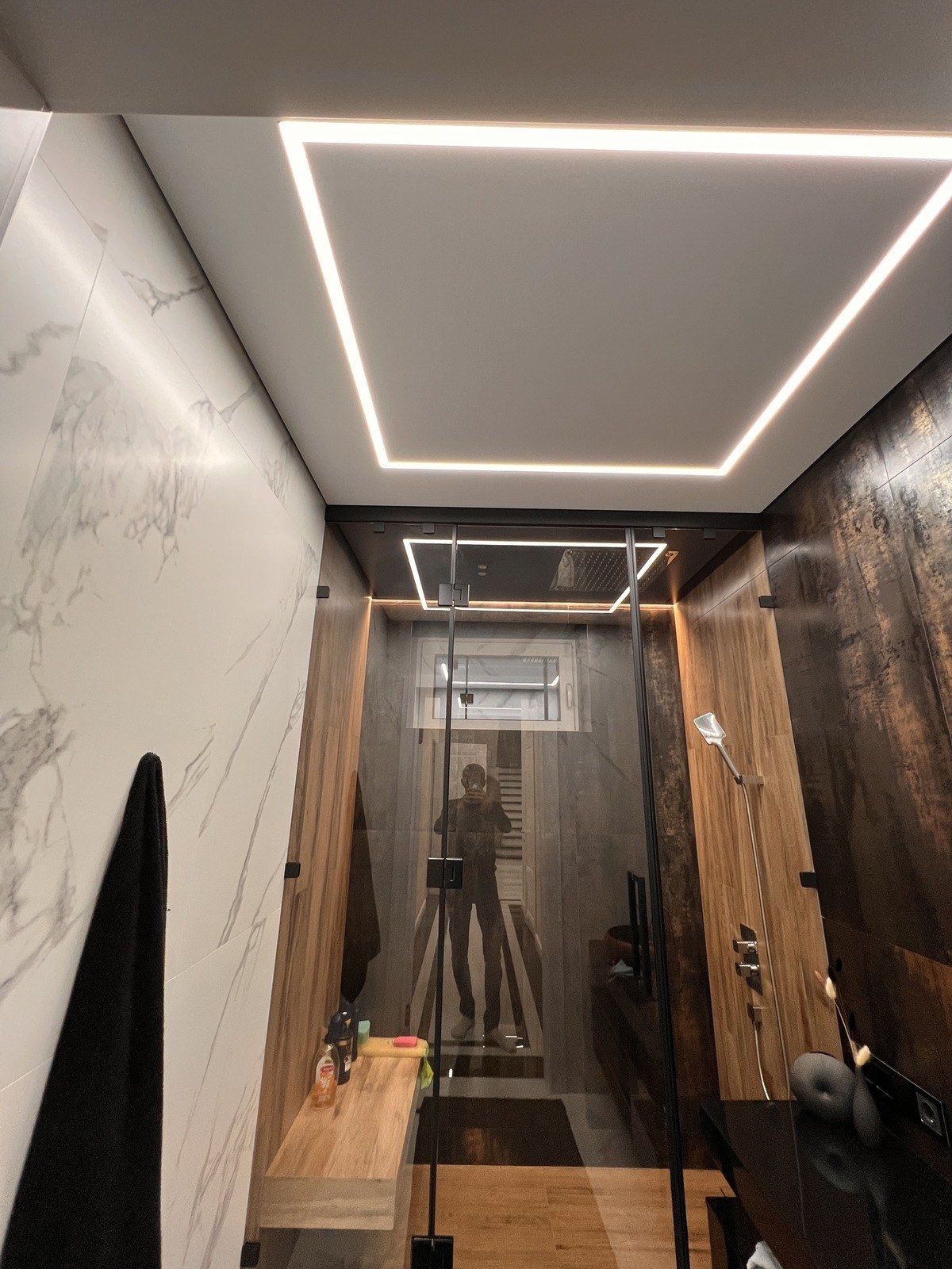 Иногда бывает так: ремонт почти готов, дизайн классный, но не хватает последнего штриха. В этой душевой мы как раз стали тем самым штрихом. Наша задача была простой — сделать хороший потолок и свет, чтобы дополнить уже готовый интерьер.
